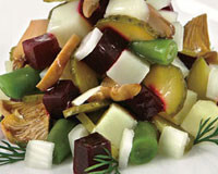 Отварить до полуготовности несколько картофелин, пару морковей и один корень сельдерея. Добавить репчатый лук, 300-400 грамм грибов (свежих или сушеных отваренных) и тушить до готовности. В конце добавить 1 банку консервированного горошка.