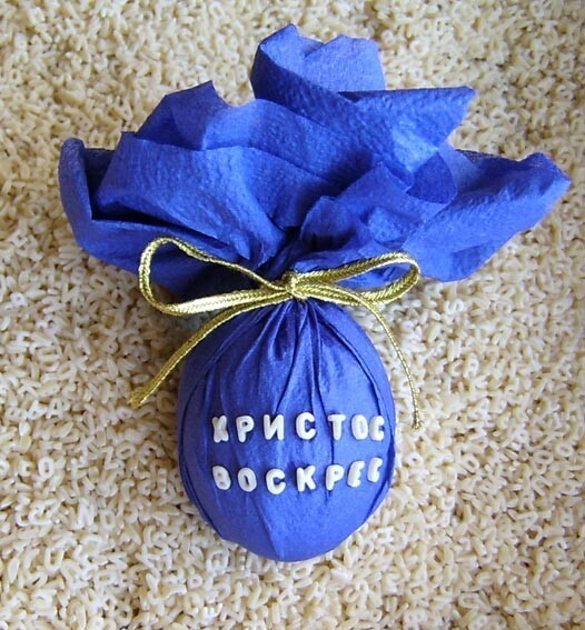 Нужно сварить яйца в воде с содой, затем обвернуть в разноцветные шелковые лоскутки, перевязать ниткой. Опять их прокипятить в этой воде, дать остыть, снять лоскутки. Сухие яйца намазать растительным маслом.
