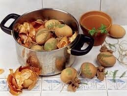 Луковая шелуха. Легко достать, легко красить. Цвет таким способом можно получить от желтого до красно-коричневого. Все зависит от концентрации отвара, чтобы цвет был более насыщенным, шелухи надо взять побольше. Варить ее нужно около получаса до того, как опускать в отвар яйца. Затем подержать еще 10 минут, вынуть и остудить.