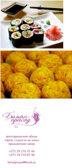 Недавно на радость минчанам-вегетарианцам у нас появилась услуга заказа вегетарианских обедов в офис от «Бимал-Прасад». Повара принципиально не используют в приготовлении блюд мясо, рыбу, яйца (даже для выпечки — нет), грибы, чеснок и лук. Сыр — строго вегетарианский, на бактериальной закваске. И при этом все выглядит сытно и аппетитно. Например, комплексный обед может включать в себя цветную капусту с картофелем и сыром, алупатру (индийский картофельный рулет) и калифорнийский салат, а стоить всего 35 тыс. бел.руб. Кроме этого в меню «Бимал-Прасад» можно найти симпатичные самосы (пирожки) с разнообразными начинками и сладости.