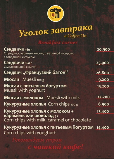 Небольшое, но очень атмосферное заведение рано утром поддержит вас острым имбирным чаем или миндально-карамельным латте. Вы можете позавтракать внутри заведения, а если сильно спешите, взять все с собой. Здесь большой выбор сэндвичей и десертов, а также, разумеется, отличного кофе и чая. В «CoffeeOn» нередко проходят интересные события, за календарем можно следить здесь.