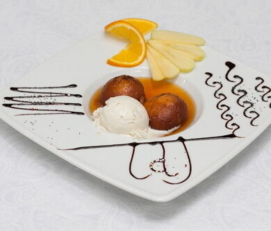 Состав: жареные шарики из молока и сыра, пропитанные сахарным сиропом и экстрактом из лепестков роз. Подается с шариком классического ванильного мороженого.