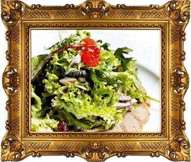 Состав: смесь разных видов салата, говядина, уши свиные, язык говяжий, красная фасоль, соленые огурцы, домашний майонез, каперсы, хрен, красная икра.