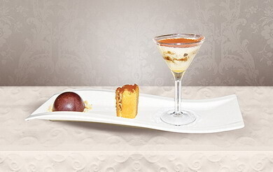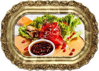 В переводе с французского «мильфей» переводится как «Тысяча листов». То есть, главным акцентом блюда является послойное чередование различных продуктов. Александр соединил сыр и томаты, а дополнил и обогатил вкус с помощью малинового винегрета с рукколой. Блюдо обладает очень тонким, запоминающимся послевкусием.