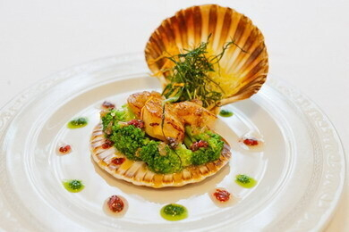 Это авторское блюдо в «La Crete d'or» подается в якобинской раковине, в которой морской гребешок и живет. Нотки вкуса — обжаренная брокколи и нежнейший кленовый винегрет с песто. Александр скромно отмечает, что готовится такое изысканное блюдо просто, главное — правильно пожарить основной ингредиент.