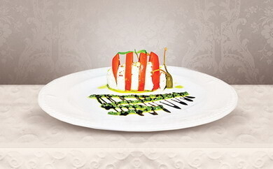 Состав: итальянский сыр моцарелла, свежие томаты, каперсы (ягоды с черенками), оливковое масло с базиликом, бальзамический соус, свежий базилик, чипсы из базилика, чипсы из томата, соус песто с руколой.