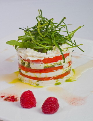 Состав: сыр «Филадельфия», свежие томаты, соль, перец, руккола, малиновый винегрет, соус базилик.