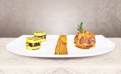 Это авторское блюдо много часов готовится в вакууме, поэтому мясо получается очень нежным и сочным. А гремолата является традиционным итальянским дополнением к блюдам из телятины. Ее Джузеппе готовит из мелко нарезанной цедры апельсина и лимона с добавлением рубленого чеснока, петрушки. Важно, чтобы основной вкус был цитрусовым, а привкус чесночным.