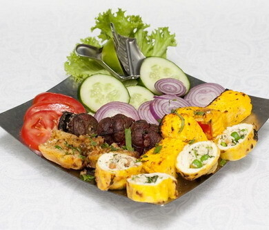 Состав: ассорти из вегетарианских индийских закусок: Тандури Бхарван Аллу, Панир Ка Сулха, Тандур Ка Хумб, Панир Шабнами.
