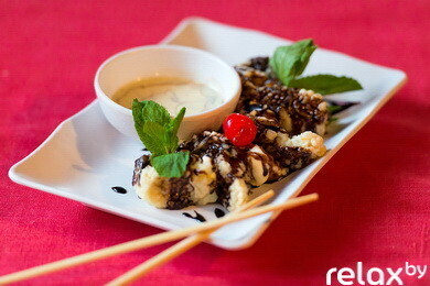Банан готовится в темпуре в специальном кляре и дополняется сливочным сыром и шоколадом. В десерте ощутима привилегия сливочного сыра, который очень интересно сочетается с шоколадом и ванильным соусом, немножко «сбивает» сладость. Этот десерт идеален для тех, кто не любит в десертах излишнюю приторность.