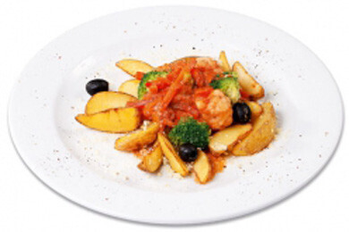 (картофельные дольки с чесноком, с обжаренными в сливочном , томатном соусе морковью, луком, сладким перцем, цветной капустой, брокколи, маслинами и сыром джюгас)