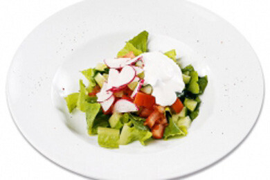 (огурцы, помидоры, листья салата, редис, сметана)