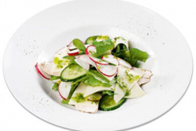 (филе куриное, сыр моццарелла, редис, листья салата, соус из зелени)