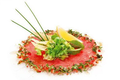 И вновь можно восхититься сочетанием: нежные, яркие ломтики свежего тунца, приправленные цитрусовым соусом, чесноком и имбирем, украшенные нежно-зелеными листьями салата и свежим лимоном. Вы нашли здесь хоть один калорийный ингредиент? А вот вкус незабываем!