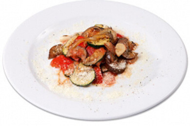 (баклажаны, цукини, морковь, перец сладкий, лук, чеснок, соус томатный, сыр джюгас, зелень)