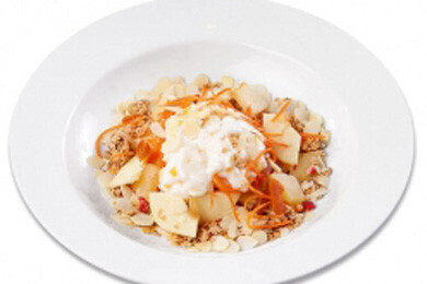 (яблоко, морковь, ананас, абрикосы, мюсли, йогурт, стружка миндаля)