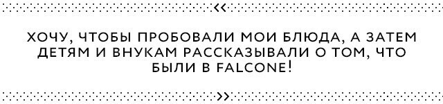 | «Хочу, чтобы люди приходили в этот ресторан, пробовали мои блюдам, а затем детям и внукам рассказывали о том, что были в Falcone. Мне не интересно, когда гость говорит «О, это блюдо я мог попробовать в другом ресторане!». |