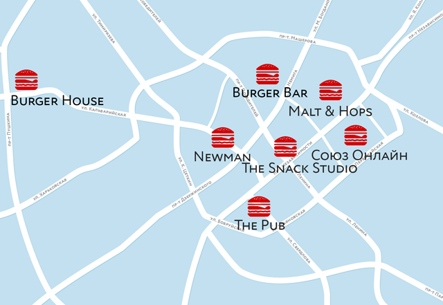 КАРТА МЕСТ С ЛУЧШИМИ ГОРОДСКИМИ БУРГЕРАМИ: РЕКОМЕНДУЕМ