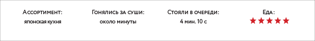 «Мир суши» — отдельный павильон, в котором суши ползут по конвейеру: выбирай, догоняй, приноси на кассу, плати, ешь. Очевидный плюс — в том, что здесь предлагают не большие наборы по 8-12 штук, а компактные сеты по четыре суши — экспериментируй и пробуй вдосталь. Кроме того, только в «Мире суши» мы наконец нашли нормальный суп («Мисо суп» за 21 000 рублей).