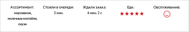 Здесь, конечно, не наешься, но какое мороженое! Делают его, говорят, по оригинальной итальянской технологии, а вкусы постоянно добавляются и обновляются: гранат, арбуз, фисташки, шоколад с вишней, «бабл-гам», «смурфики»... Отдельный зачет официантам — приветливые, готовые рассказать, что из чего приготовлено, и ответить на любые вопросы, даже самые идиотские. Кроме мороженого здесь предлагают смузи, свежевыжатые соки, молочные коктейли и фраппучино.