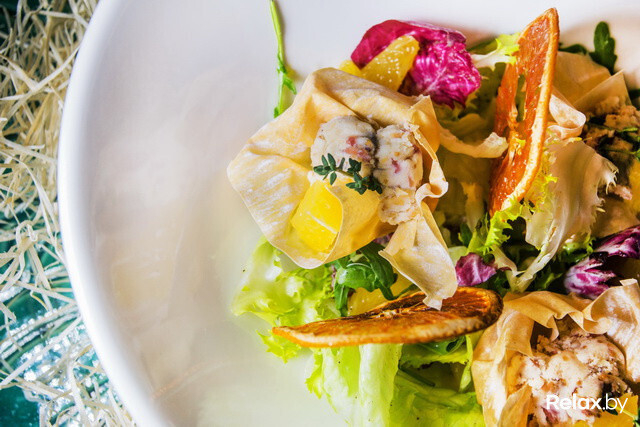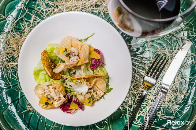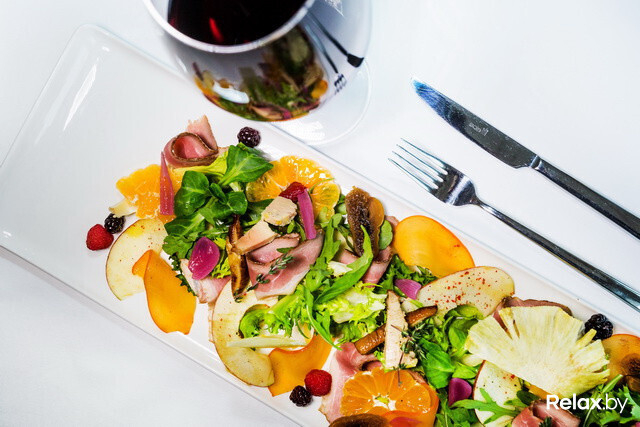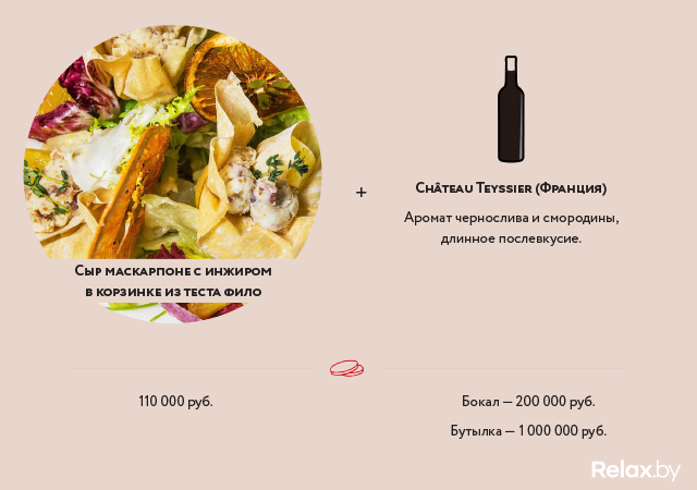Свежее сочетание: листья салата шеф-повар дополняет мякотью апельсина и заправляет оливковым маслом. Маскарпоне неплохо гармонирует с инжиром и фундуком. Блюдо вполне подошло бы и к белому вину, но сомелье настаивает на красном французском Château Teyssier с заметным ароматом чернослива и смородины и длинным послевкусием.