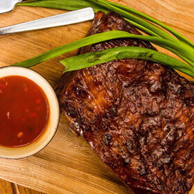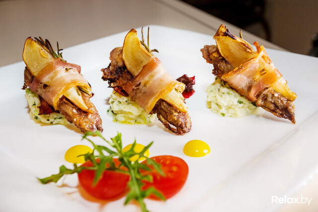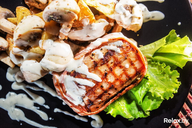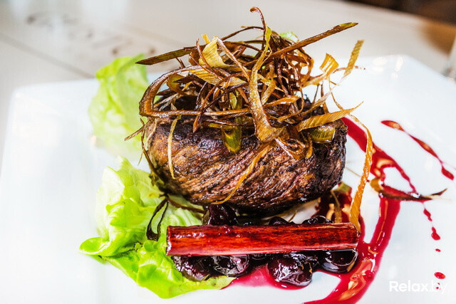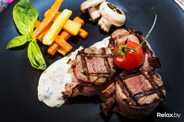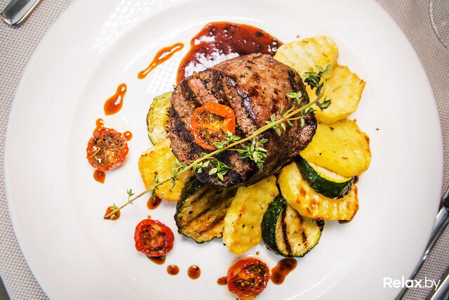 Для стейка здесь используют говядину исключительно высшего сорта. Подается с пряно-коньячным соусом, который готовиться не менее 72 часов. На гарнир Станислав предлагает картофель на гриле с розмарином и цукини. Выбранное вино сомелье описывает так: «Фруктово-пряный аромат и сбалансированный вкус подчеркивают бархатистые танины и умеренную кислотность».