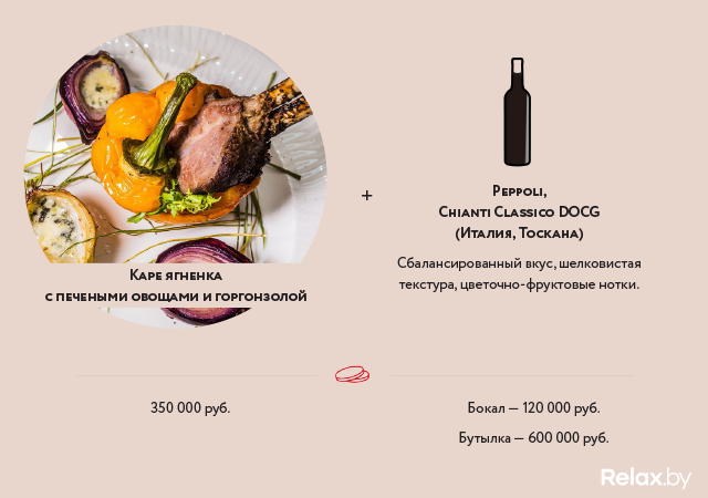 Каре ягненка Евгений Завадский готовит по не совсем классическому рецепту и подает с печеным сладким перцем и травами. Белый и красный лук с начинкой из горгонзолы запекается прямо в шелухе — характерный авторский штрих. В качестве идеальной пары — тосканское Peppoli, Chianti Classico DOCG со сбалансированным вкусом, шелковистой текстурой и, по словам сомелье, цветочно-фруктовыми нотками. В аромате — явные оттенки спелой вишни, шоколада и ванили.
