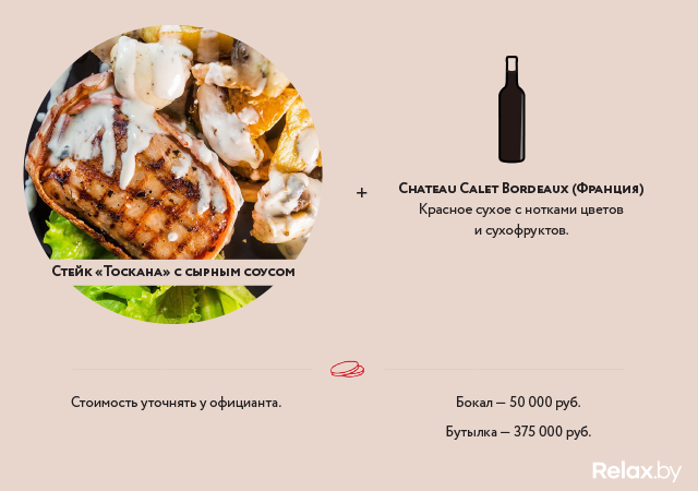 Классический стейк Павел Автухович дополняет вишневым соусом, проваренном в красном вине с корицей. Отсюда и идеальное сочетание с французским Médoc, известным своим насыщенным вкусом с нотками черных фруктов и пряностей. Специи чувствуются и в аромате. Помимо говядины к нему безупречно подойдут дичь и сыры.