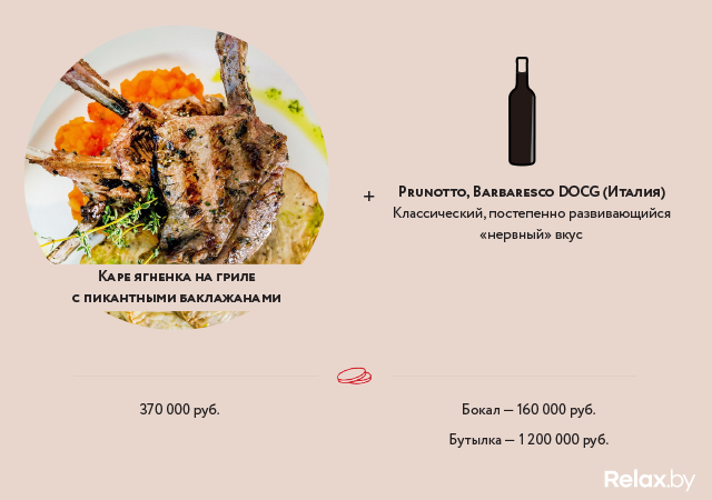 Для своего каре литовский шеф-повар Станислав Казеневич делает нежный маринад с лепестками свежей мяты. Пикантные баклажаны готовятся на гриле со сливочным сыром. В основе соуса для каре — мякоть свежих помидоров и курага. С итальянским Prunotto сочетается безупречно: у вина классический, постепенно развивающийся «нервный» вкус.