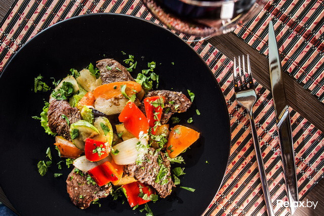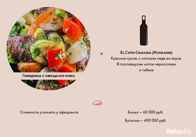 Опять красное сухое, но уже с нотками меда во вкусе. В послевкусии, по словам сомелье, почувствуете чернослив и табак. Блюдо из меню в пару — говядина с баклажанами, цукини, свежим перцем, томатами, аджикой и зеленью.