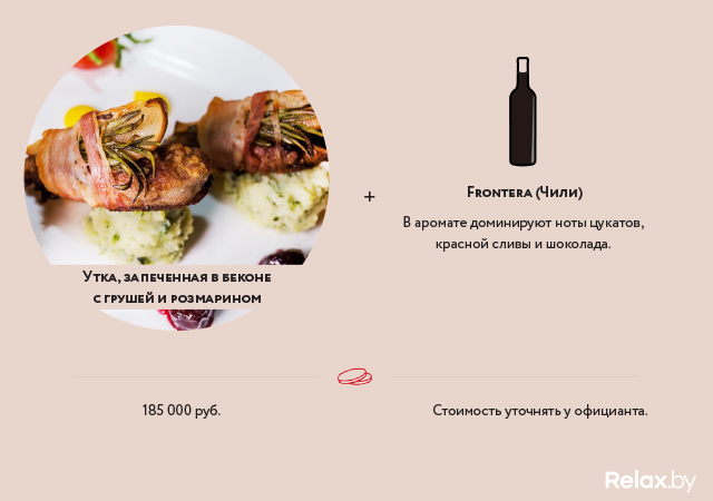 В качестве гарнира к этому блюду Павел предлагает картофельное пюре со шпинатом. Подается с кисло-сладким соусом, а дополняется чилийским Frontera. Это первое вино нашего гида, в аромате которого доминируют ноты цукатов, красной сливы и шоколада. Кстати, неплохо подходит к острым и тушеным блюдам, а также к пасте.