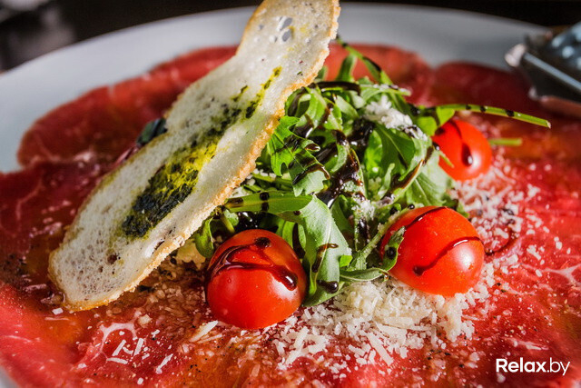 Тонко нарезанную мраморную говядину Сергей подает с рукколой и пармезаном. Из винной карты выбираем свежий напиток с тонкой текстурой, бархатными танинами и хорошо выраженной кислотностью. Кстати, помимо красных к карпаччо подходят и розовые столовые вина.