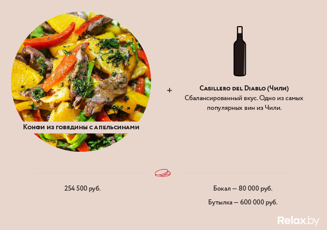 Такое сочетание ингредиентов, по словам шеф-повара, может показаться необычным. Апельсин придает говядине своеобразный вкусовой оттенок. Выбранное вино одно из самых популярных в Чили. У нас популярно благодаря сбалансированности вкусовых характеристик и адекватной цены. Учтите: перед подачей вино должно быть охлаждено до 15-16°С.