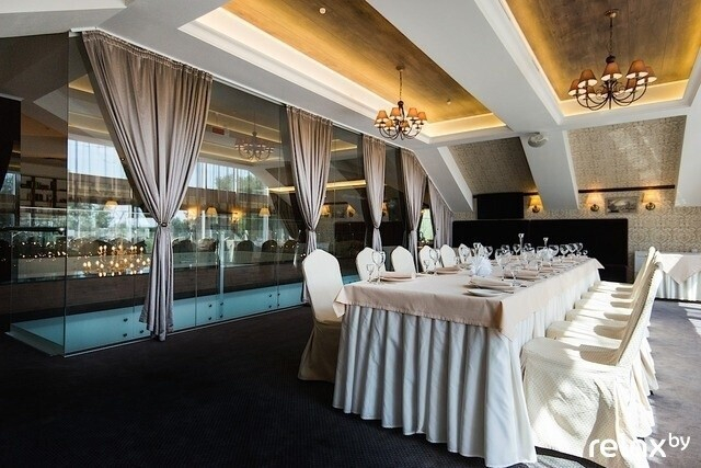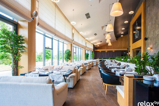 На побережье Минского моря отель (на 20 персон) и трехъярусный ресторан (до 80 гостей) комплекса Riviera появились этой зимой. Вероятно, влюбленных сюда влечет оборудованная на воде площадка, которую к лету стилизуют под корабль, натянув тенты-паруса — полезная деталь для свадьбы в стиле «Алых парусов». Еще здесь есть крыша для вечеринок и балкончики с видом на водную гладь. Кухня в ресторане Riviera европейская с элементами белорусской; есть и авторские позиции.