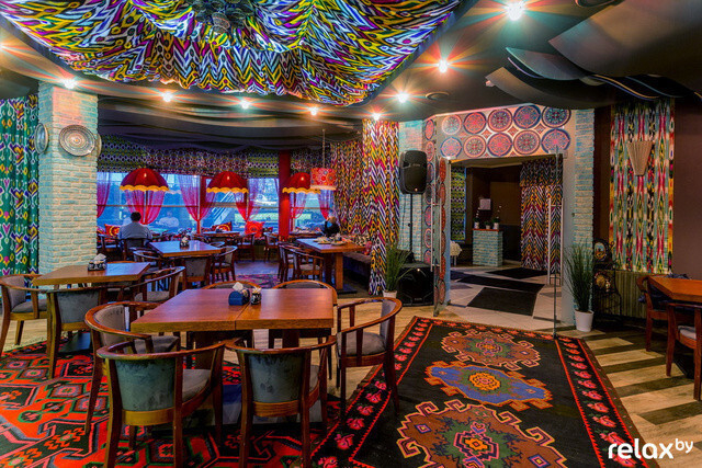 В колоритном восточном лаунж-кафе в окружении орнаментов и ковров hand-made можно сытно и вкусно пообедать: в меню — популярные блюда узбекской кухни с небольшим вкраплением европейской (лагман, манты, чак-чак, узбекская пахлава, четыре вида плова, самса и многое другое).