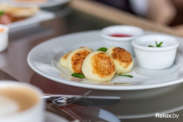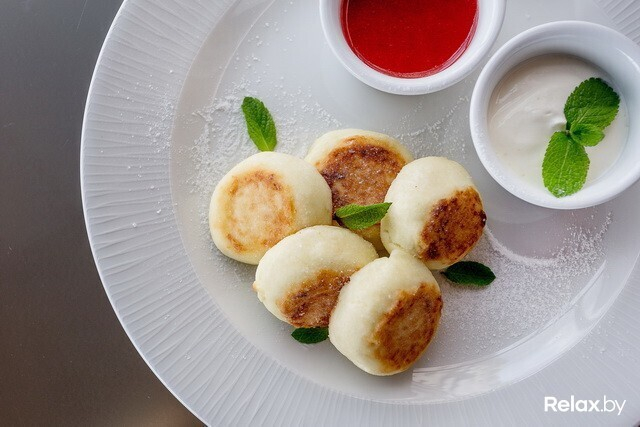 А вот третья позиция придется по душе девочкам-сладкоежкам. Такие воздушные сырники найдутся не в каждом заведении столицы. Пышные кругляши из творога и яйца подают посыпанными сахарной пудрой и украшенными мятой, со сметаной и натуральным клубничным соусом.