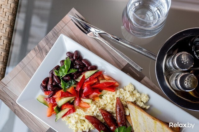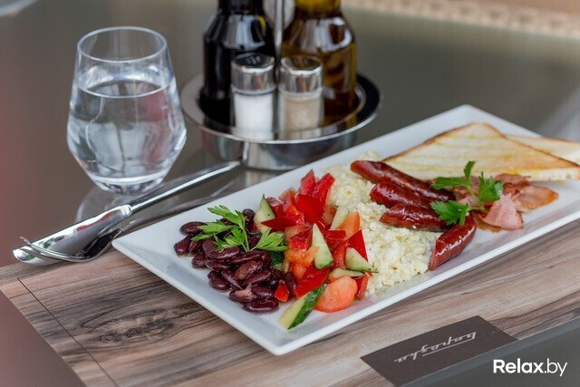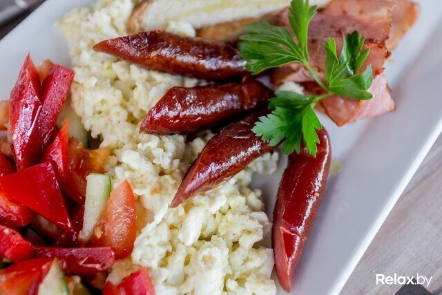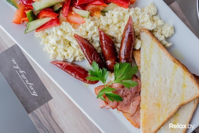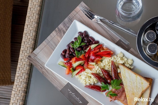 Другая позиция пользуется особой популярностью у мужчин. Нежная яичница-болтунья готовится со сливками и зеленью, а подается с фасолью, свежим салатом из огурцов, помидоров и красного перца, хрустящими тостами, а также грудинкой и пикантными колбасками. Сытный и вкусный завтрак.