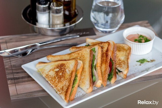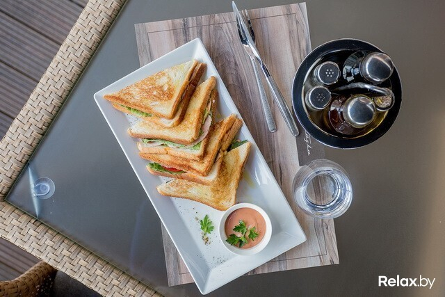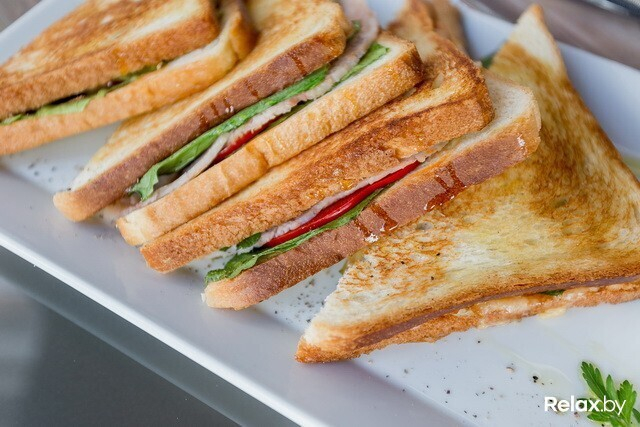 Первое топовое блюдо из трех представляет собой аппетитные тосты с ветчиной, маринованным огурцом, красным перцем, листьями салата, сыром и зеленым луком, которые подают с розовым соусом. Стоит отметить, что весьма щедрая порция из четырех хрустящих ароматных треугольничков точно в силах насытить голодного мужчину, а уж девушкам спокойно можно заказывать такую пополам.