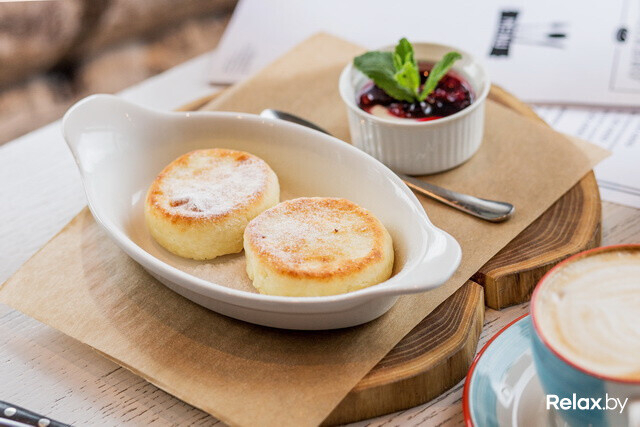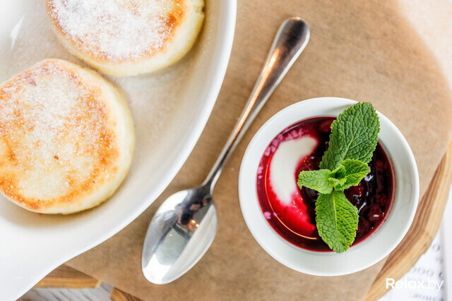 Подают воздушные сырники здесь со сметаной и домашним вареньем.