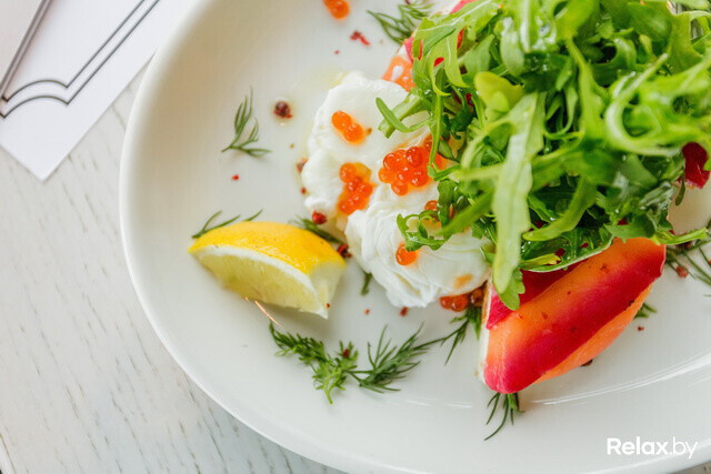 В аппетитной компании — яйцо пашот, маринованный лосось, красная икра, руккола, тостовый хлеб и сыр Маскарпоне.