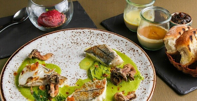 2. Нежная треска с зеленым соусом, тушеными листьями салата Романо, миндальными хлопьями и маринованными в устричном соусе вешенками