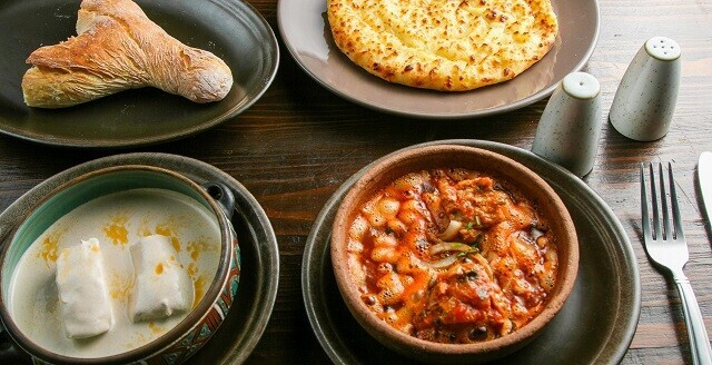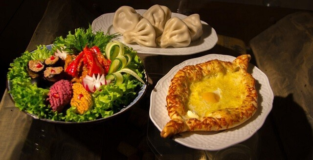 2. «Аджабсандали» — раздельно обжаренные баклажаны, болгарский перец и томаты со специями, зеленью и луком; подается в холодном виде с добавлением чеснока