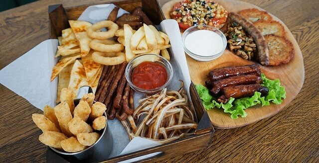 1. Колбаски «Кабандос прованс», сырные палочки, чесночные хлебцы, картофельные чипсы, луковые кольца, уши к пиву, чипсы из тортильи; подается с огненным соусом