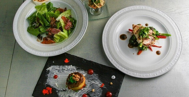 1.Тёплый салат с индейкой и томатами Черри: салат Микс, филе индейки, соус Терияки, сыр Дор блю, томаты Черри, груша карамелизированная, перец свежий, цукини