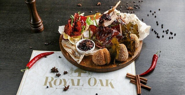 2. Мясо «Сытное» мини, драники со сметаной, жареные с луком лисички, запеченные ребра, колбаски «Бургунские»