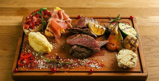 1. Сочный стейк с картофельным пюре и овощами гриль, которые подаются на доске, дополненной двумя видами брускетты