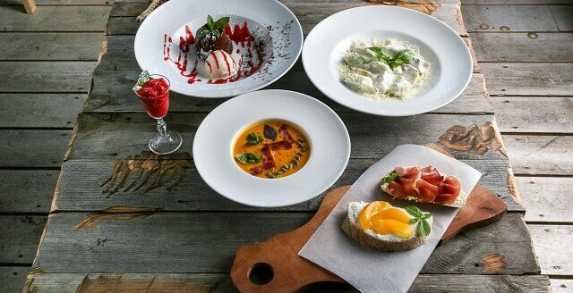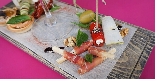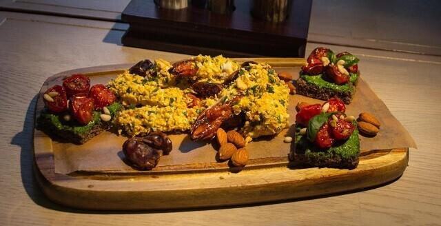 1. Сет под бокал вина: печёная морковь со сливками из кешью в компании со сладкими финиками и хрустящими орехами; брускетта с соусом песто, вяленые томаты черри и большие домашние итальянские оливы