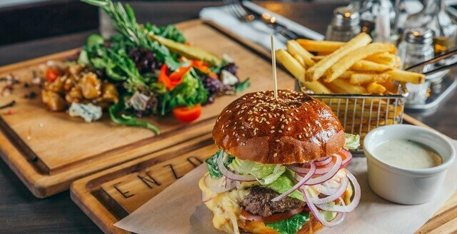 2. Бургер ENZO: булочка из французских смесей собственного производства, котлета из говядины, соус Чеддер, лук красный, салат Ромен, томат, огурец маринованный, фирменный соус для бургеров