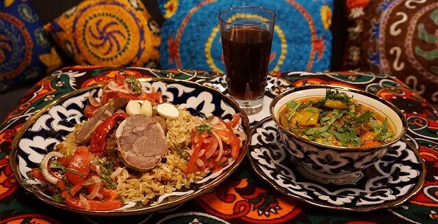 2. Плов «Праздничный»: мясо курдючного барашка, морковь желтая и оранжевая, нут, изюм, восточные специи; колбаса из конины Казы, яйца перепелиные, перец острый, гранат; салат к плову Ачик-чучук: томаты, лук белый салатный, перец острый базилик
