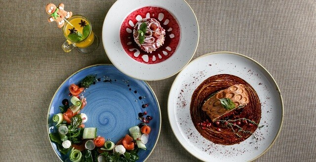 3. Ассорти «Пхали» — отварные овощи, перетертые с грецких орехом, кинзой, специями и чесноком; подается с зернами граната и ореховым маслом